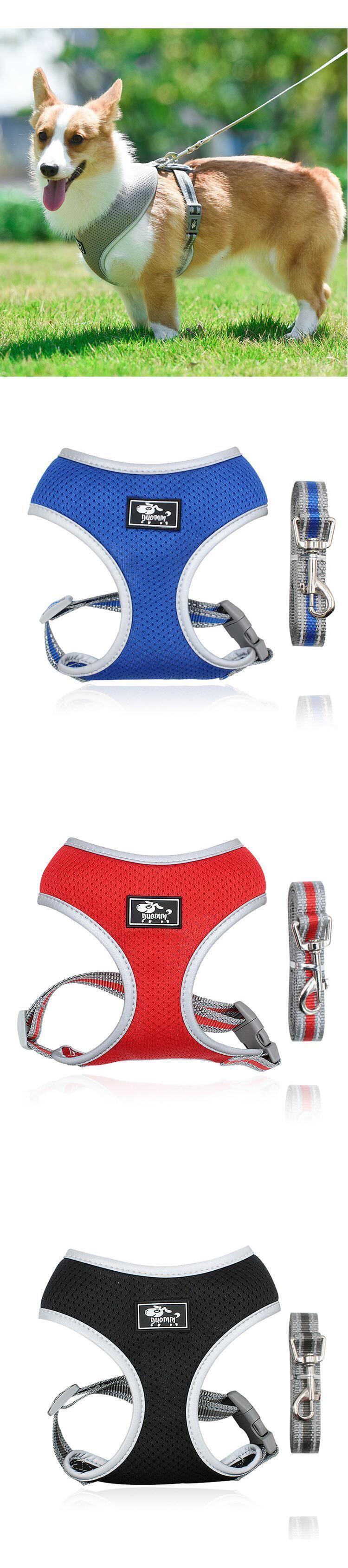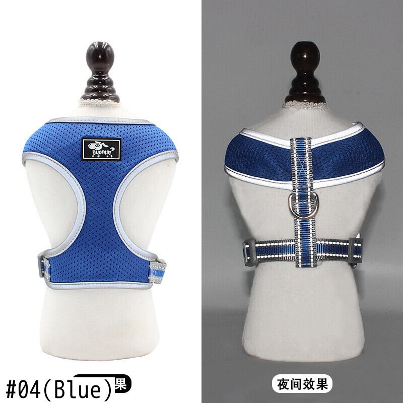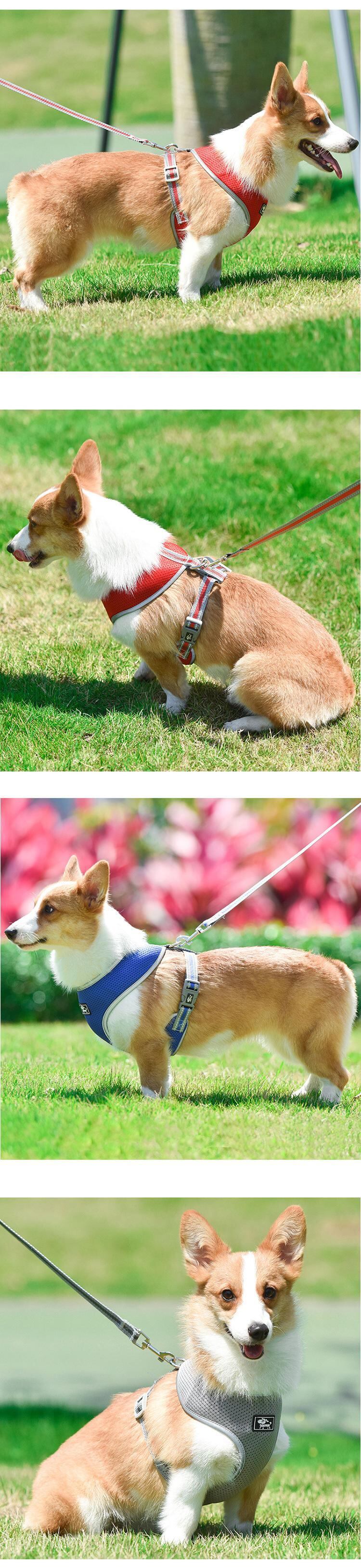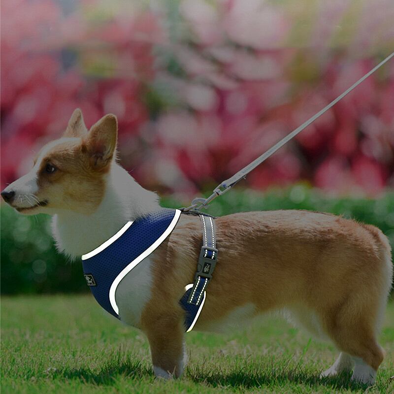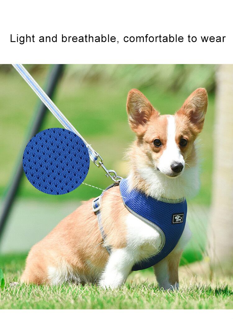 新作 通気性のある犬のハーネスと鎖のセットメッシュ反射布沼胸のハーネス小型犬1.5Mの長さの犬の鎖ペット用品