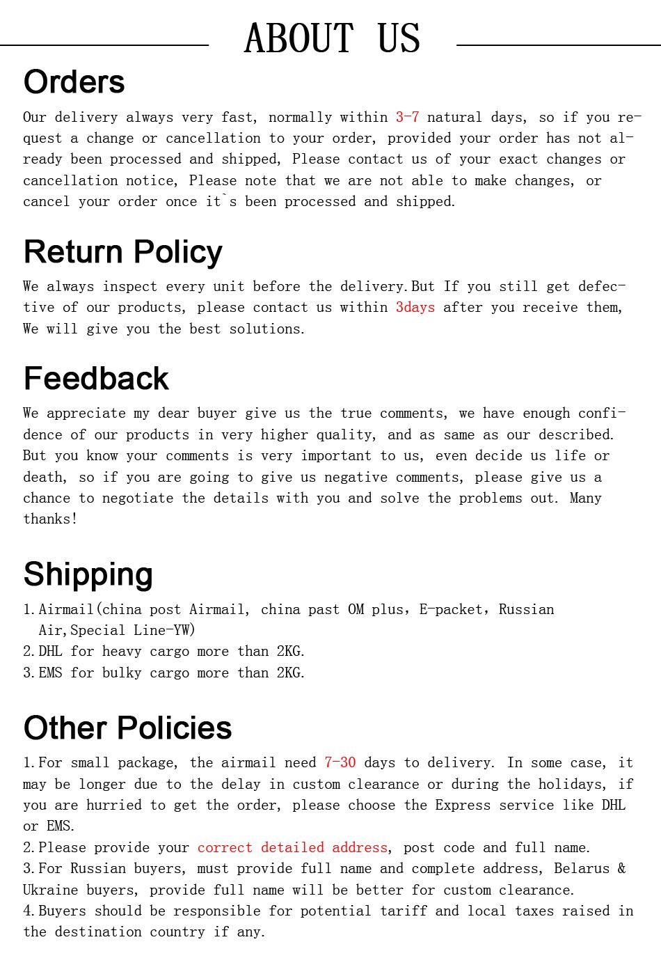 商品到着後のサイズ変更やカラーやイメージが違う等、 落札者様の都合での商品交換、返品は一切お受けしておりません。